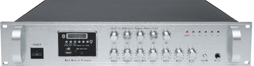 帶有前置放大器,具有2路話筒輸入,其中MIC2話筒帶默音強(qiáng)插功能。便于緊急廣播,高低音可調(diào)。
